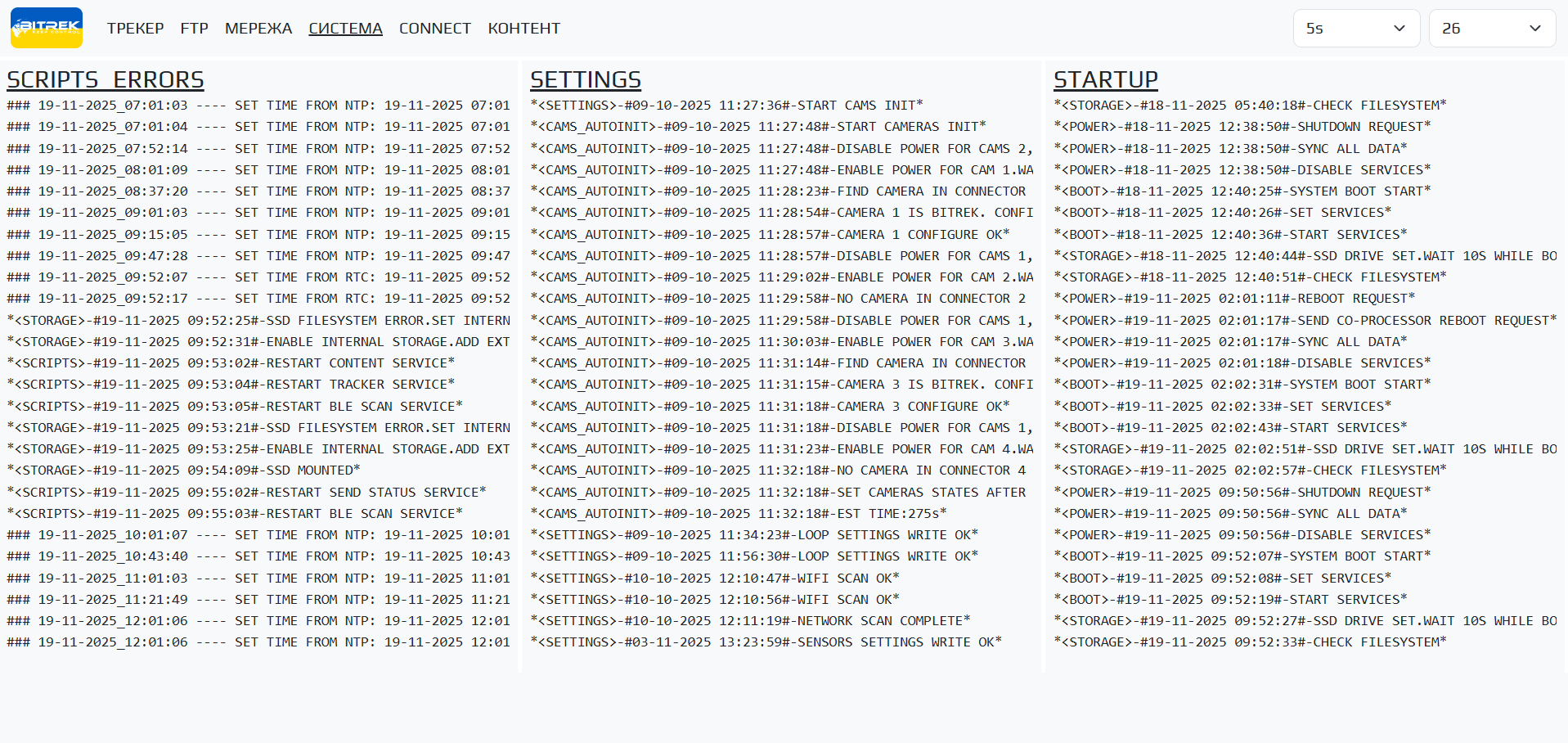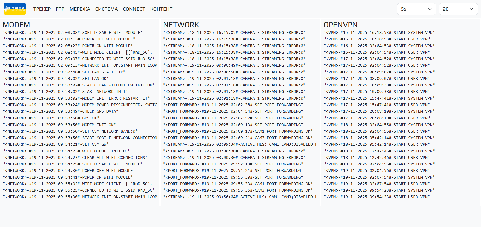 в mNVR передбачена можливість перегляду логів на пристрої для діагностики неполадкок. Для цього потрібно зайти на вкладку “ІНФО/ЛОГИ/ВІДКРИТИ”