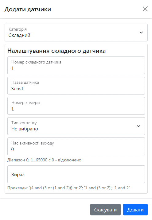 Коли ви створюєте ДВА або більше датчики, ви можете їх об’єднати, створивши складний сенсор. Для цього потрібно вибрати тип сенсора, вказати його діапазон, час активності виходу та написати вираз, який дорівнює відношенню між датчиками для їхньої коректної роботи