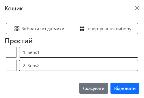 Ви можете вибрати декілька датчики, або ж вибрати всі, або ж зробити інвертований вибір та видалити датчики які вам потрібно, виділені датчики будуть переміщені до кошика