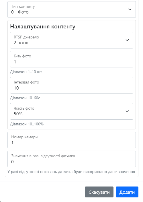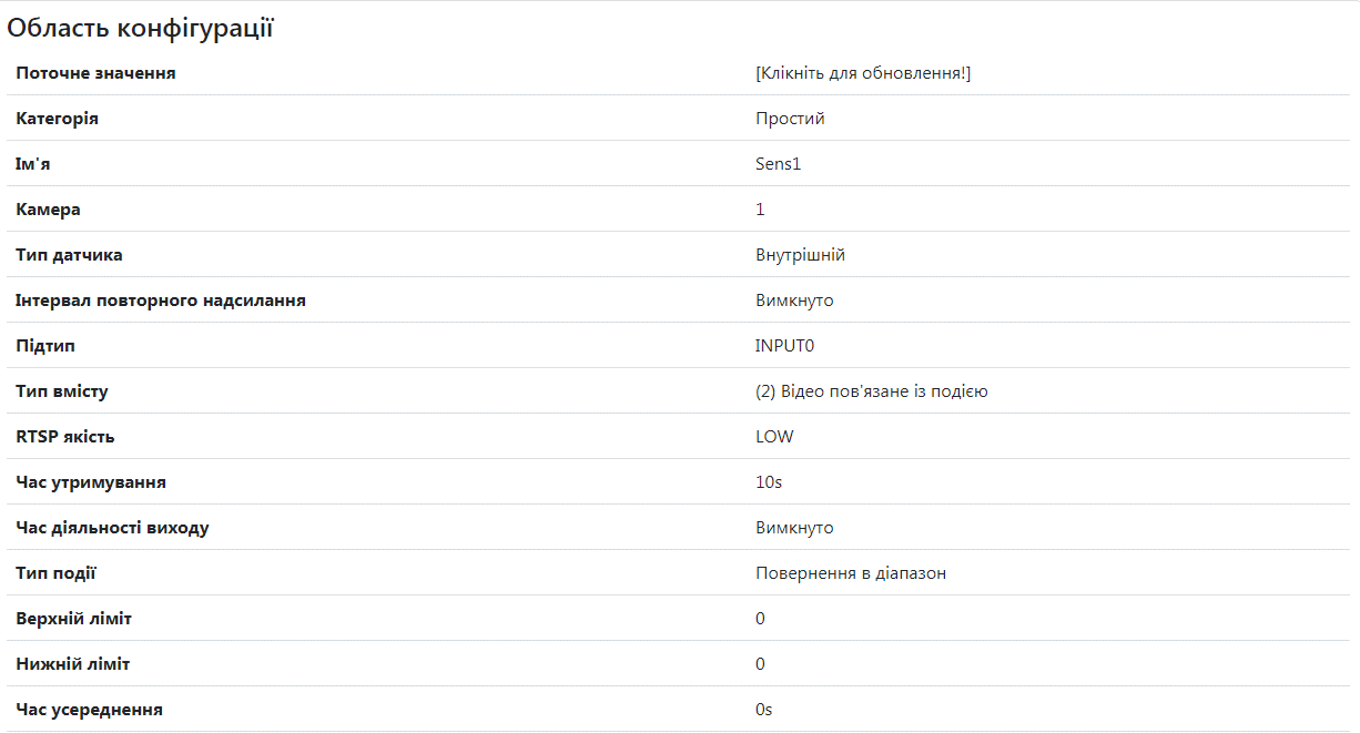 Розділ містить вибір підтипу датчика, номер камери, лічильник фото та його інтервал, RTSP джерело та посилання на нього, максимальний час відео пов’язаного з подією, кількість фото та кадрів в секунду, час відео, інтервал між фото пов’язаним з подією, його лічильник та якість тип вмісту, тип події, верхній та нижній ліміт, середній час очікування, та інтервал між повторним надсиланням