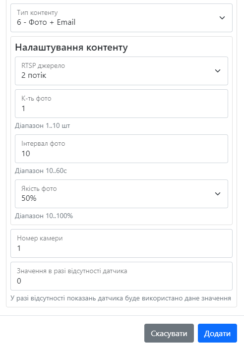 | Фото + Email | Дозволяє вибрати джерело RTSP, лічильник фото, інтервал між ними та їхню якість |