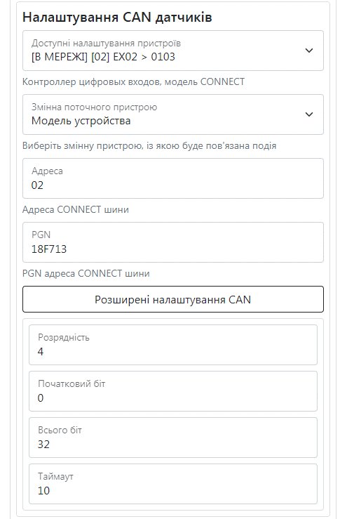 Рисунок 12 – Налаштування CAN датчиків