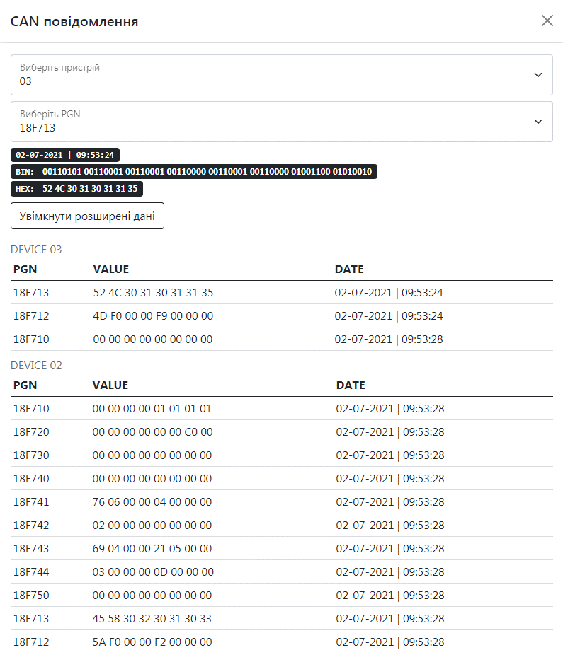 Ви можете перевірити стан вашого пристрою натиснувши кнопку CAN Повідомлення. Тут ви зможете перевірити потрібний вам пристрій вибравши його CONNECT ID та PGN та побачити значення які пристрій буде надсилати. Значення буде надіслано в 16-вій системі обчислення, що перевести її в десяткову вам потрібно виділити її значення, а результат появиться у нижньому правому куті