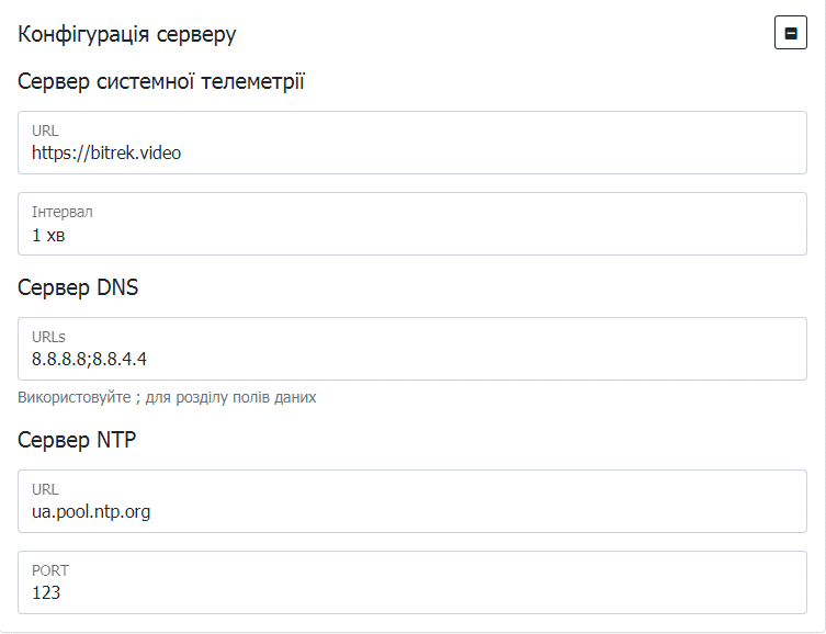 | Сервер системної телеметрії Інтервал | Інтервал відправлення системної інформації на заданий сервер |