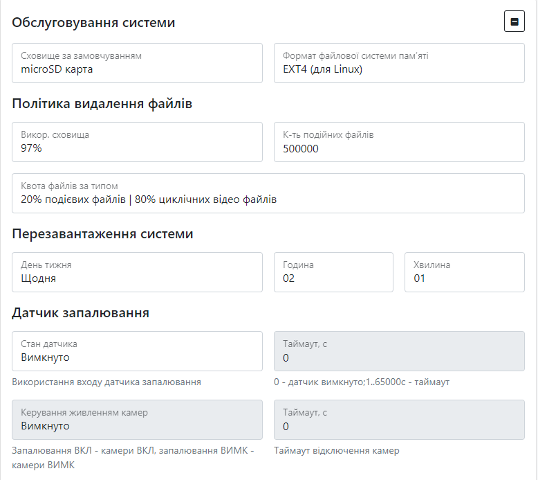 | Таймаут увімкнення камер (0-65000 с) | Час увімкнення камери, відлік якого починається із появою напруги |