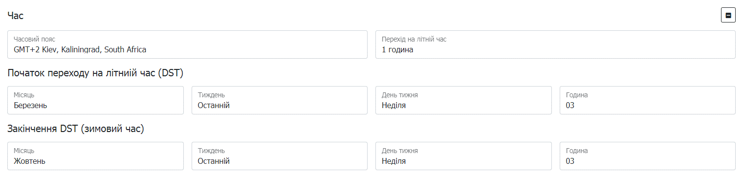 | Закінчення DST (зимовий час) | Налаштування переведення годиннику на «зимовий час» |