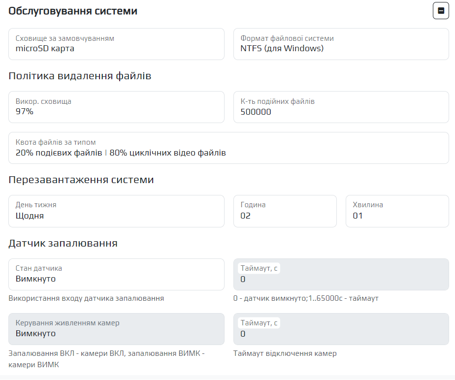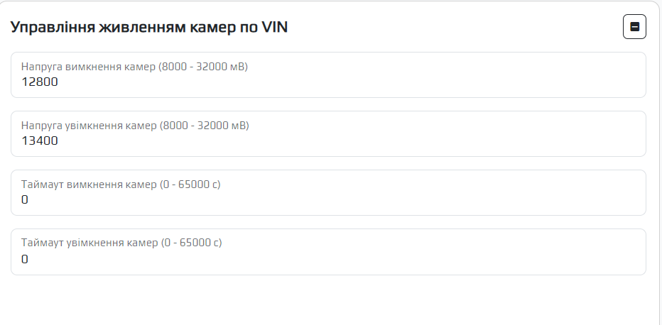 | Таймаут увімкнення камер (0-65000 с) | Час увімкнення камери, відлік якого починається із появою напруги |
