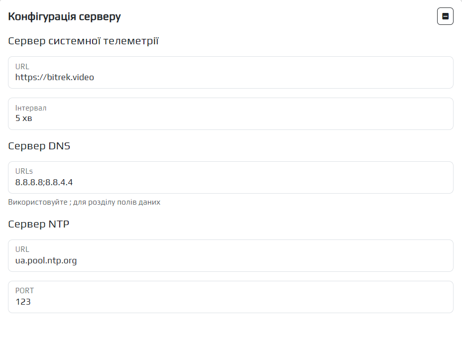 | Сервер NTP | Адреса та порт NTP серверу синхронізації часу |