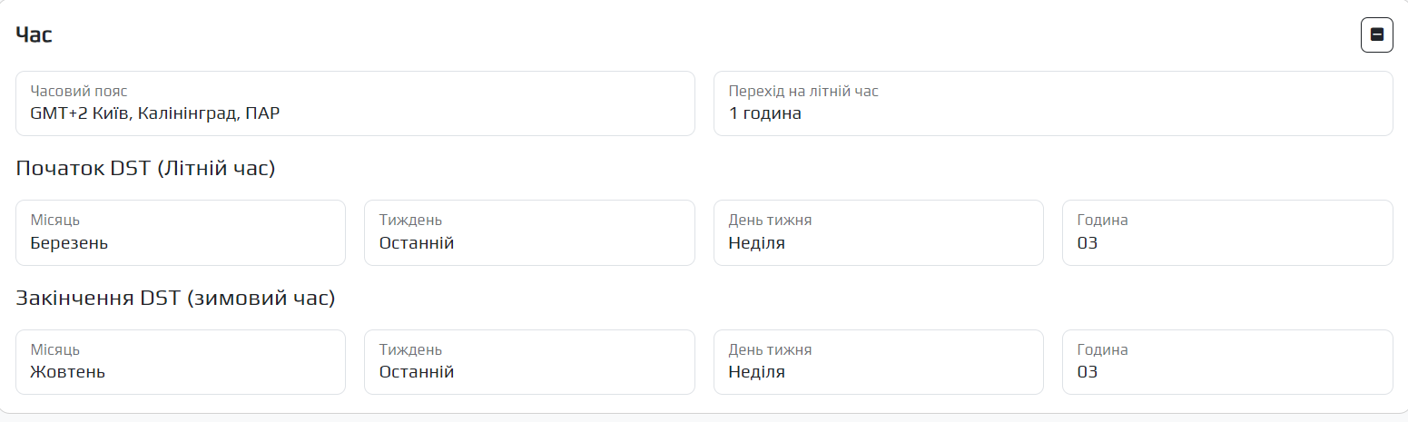 | Закінчення DST (зимовий час) | Налаштування переведення годиннику на «зимовий час» |