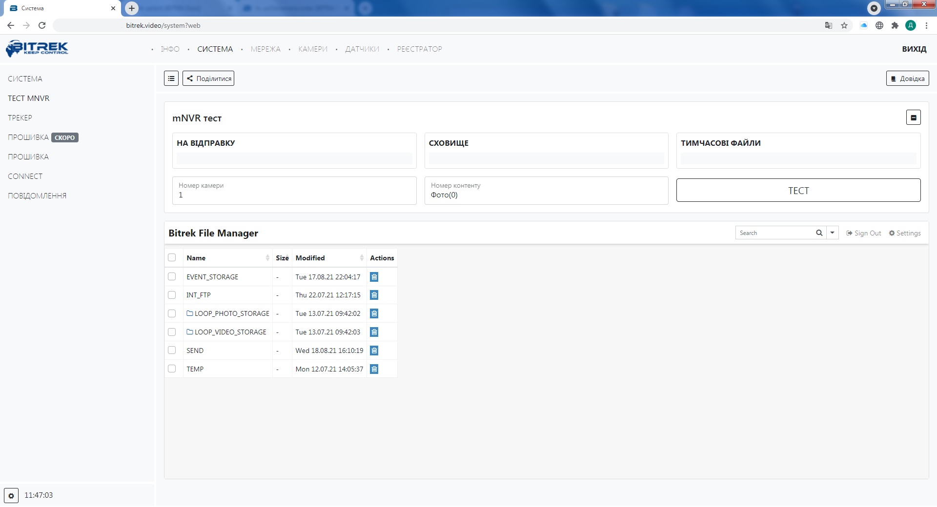 Ви потрапите на сторінку тесту, де підключивши камеру, можете протестувати її працездатність, вибравши номер порту до якого вона підключена(номер камери) та тип контенту який буде тестуватися, після вибору цих параметрів потрібно натиснути кнопку тест, після чого переглянути наявність тестового типу контенту у файловому менеджері Bitrek