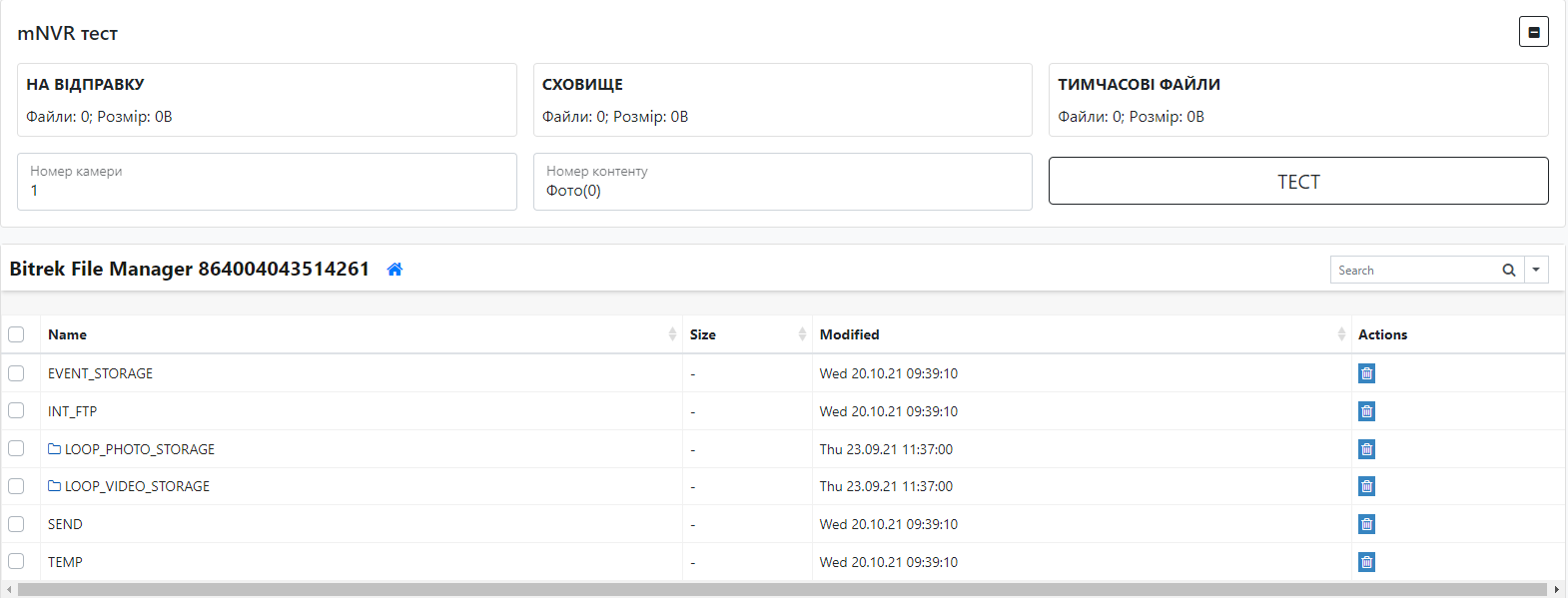 mNVR test На вкладці “SYSTEM/тест mNVR” можна вибрати камеру для тесту, зробити фото, записати відео на фіксований час, відео сфокусоване на події, та залежні фото та відео, та опісля переглянути їхню наявність у файловому менеджері Рисунок 1 - Розділ mNVR тест