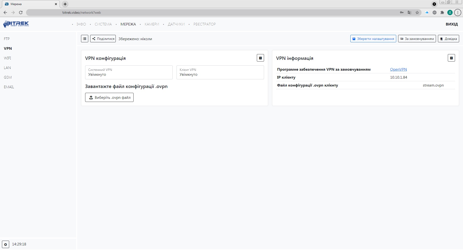 Після цього потрібно зайти в меню конфігурації приладу, та перейти на вкладку Мережа/VPN