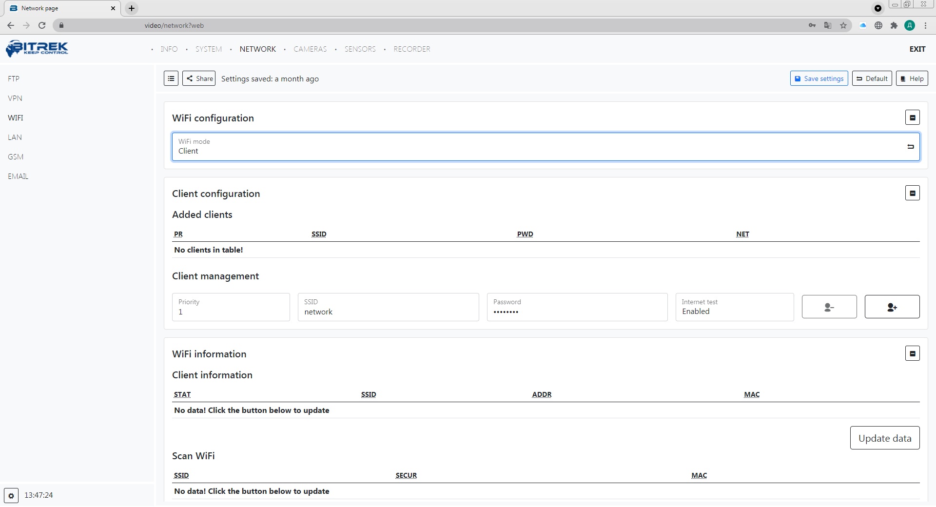 Після цього вам потрібно натиснути кнопку Scan WiFi для перегляду наявних WiFi мереж. Переглянувши SSID, тип безпеки точки доступу та її MAС-адресу, в меню керування клієнтами ви можете налаштувати приоритет підключення до точок доступу, та ввести їхній SSID та пароль, також при бажанні ви можете провести тест з'єднання для визначення якості сигналу
