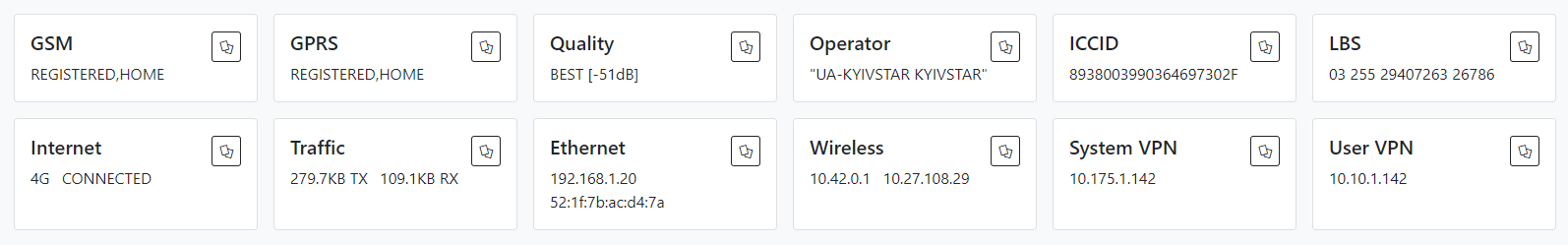 Цей розділ необхідний для отримання інформації про GSM GPRS якості сигналу, оператора, ICCID, LBS, LBS Місцезнаходження, інтернету, трафіку, Ethernet, Бездротової мережі, та OpenVPN