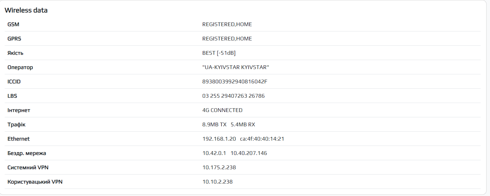 Цей розділ необхідний для отримання інформації про GSM GPRS якості сигналу, оператора, ICCID, LBS, LBS Місцезнаходження, інтернету, трафіку, Ethernet, Бездротової мережі, та OpenVPN